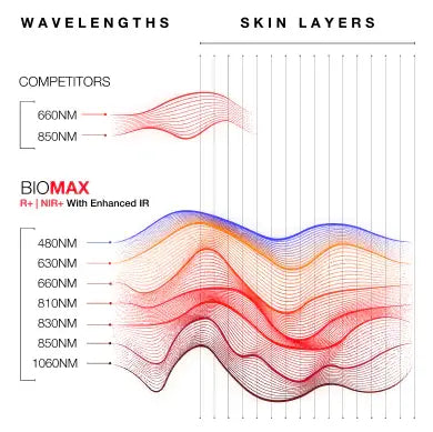 The BIOMAX series includes seven wavelengths across the red and near-infrared spectrum commonly studied in red light therapy research.